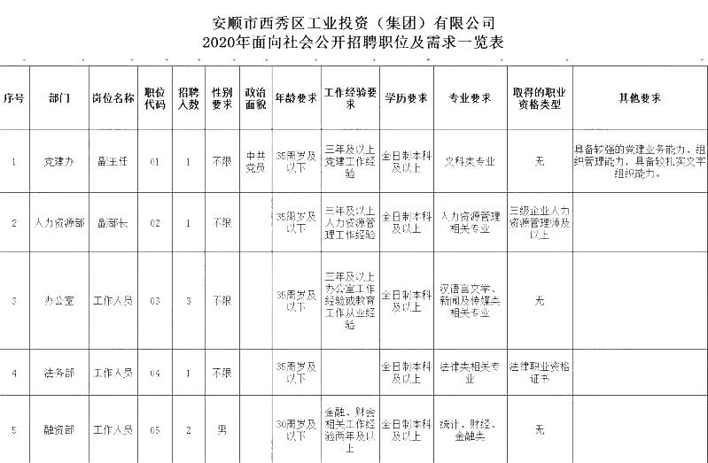 具體招聘崗位和要求見《安順市西秀區(qū)工業(yè)投資(集團(tuán))有限公司2020年面向社會(huì)公開招聘職位及需求一覽表》(附件1)。