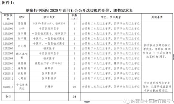 選拔全日制二本及以上學(xué)歷畢業(yè)生34人。具體詳見(jiàn)附件1《納雍縣中醫(yī)院2020年面向社會(huì)公開(kāi)選拔擬聘職位、職數(shù)需求表》。