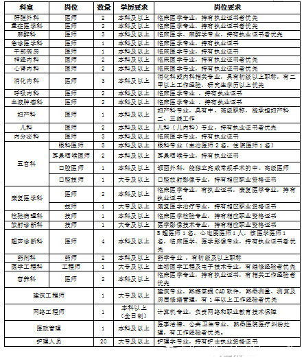 2020年招聘需求共計70名,臨床醫(yī)師36名,醫(yī)學影像醫(yī)師4名、技師2名,臨床藥師2名,康復治療技師1名,臨床醫(yī)學檢驗技師1名,護理人員20名,工程師3名,醫(yī)政管理1名。