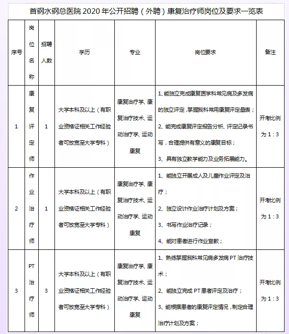 為進(jìn)一步推動首鋼水鋼總醫(yī)院康復(fù)醫(yī)學(xué)科建設(shè),更好服務(wù)患者,因業(yè)務(wù)發(fā)展需要,決定面向社會公開招聘康復(fù)工作人員5名,現(xiàn)將招聘事項公告如下: